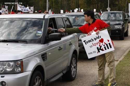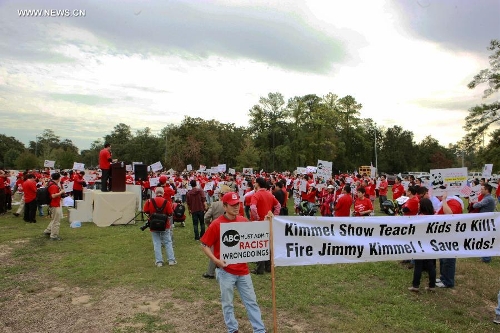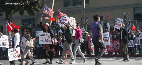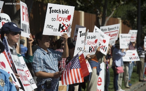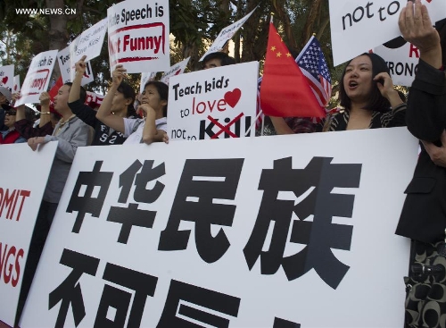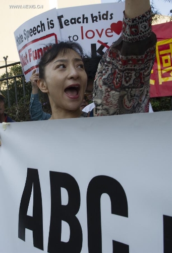 Chinese protesters gather during a protest against the rhetoric of racial discrimination of the American Broadcasting Company (ABC) in Houston, Nov. 9, 2013. (Xinhua/Song Qiong)