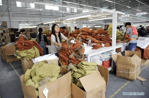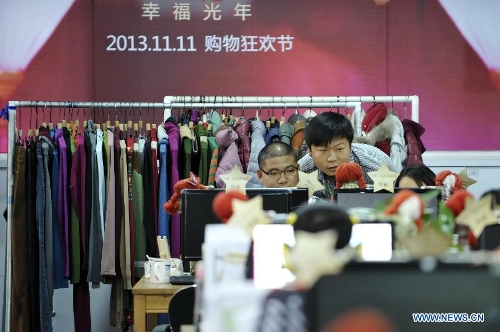 Workers check the quality of clothes for sale at the logistics center of a Tmall online shop in Guangzhou, capital of south China's Guangdong Province, Nov. 5, 2013, making preparations for the upcoming "Singles' Day" shopping promotion on Nov. 11. Alibaba Group, operator of China's biggest e-commerce platforms, will launch a shopping festival on Nov. 11 on its consumer-oriented platform Tmall.com, highlighting big discounts. Sales on Tmall.com reached 13.2 billion yuan ($2.2 billion) on that day last year. (Xinhua/Liang Xu)