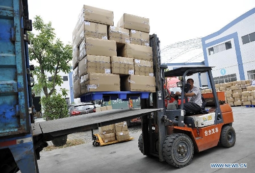 Workers load goods at the logistics center of a Tmall online shop in Guangzhou, capital of south China's Guangdong Province, Nov. 5, 2013, making preparations for the upcoming "Singles' Day" shopping promotion on Nov. 11. Alibaba Group, operator of China's biggest e-commerce platforms, will launch a shopping festival on Nov. 11 on its consumer-oriented platform Tmall.com, highlighting big discounts. Sales on Tmall.com reached 13.2 billion yuan ($2.2 billion) on that day last year. (Xinhua/Liang Xu)