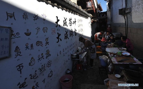 People have breakfast in the old town of Lijiang, southwest China's Yunnan Province, Nov. 8, 2013. Lijiang, which covers the title of World Cultural, Natural Heritage and Memory of the World Programme, has become a popular tourist attraction. (Xinhua/Lin Yiguang)