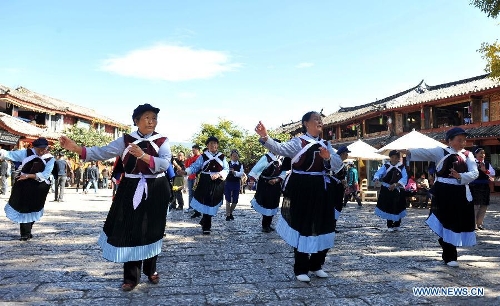 Women of the Naxi ethnic group dance in the old town of Lijiang, southwest China's Yunnan Province, Nov. 10, 2013. Lijiang, which covers the title of World Cultural, Natural Heritage and Memory of the World Programme, has become a popular tourist attraction. (Xinhua/Lin Yiguang)