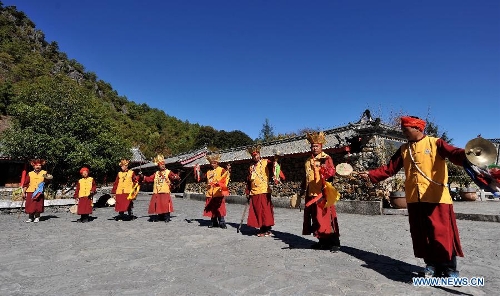Men of the Naxi ethnic group prepare for the Dongba ancient dance in the Yushuizhai scenic area of the Lijiang old town, southwest China's Yunnan Province, Nov. 9, 2013. Lijiang, which covers the title of World Cultural, Natural Heritage and Memory of the World Programme, has become a popular tourist attraction. (Xinhua/Lin Yiguang)
