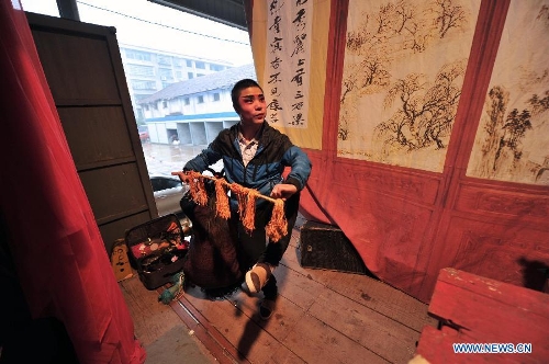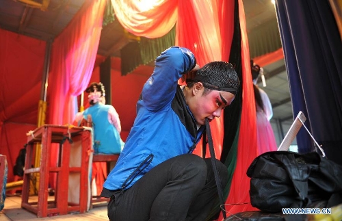 An actor of the Taojiang County Huagu Opera Troupe prepares for the performance at Zuojialun Village of Yingfengqiao Town in Yiyang City, central China's Hunan Province, Nov. 11, 2013. Being part of the activities of the 1st China Hunan Huagu Cultural Festival, several Huagu Opera troupes will go on a performing tour to 88 towns and villages in Yiyang. (Xinhua/Cheng Tingting)