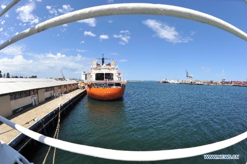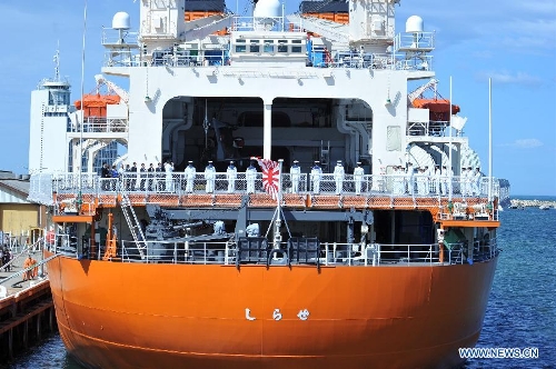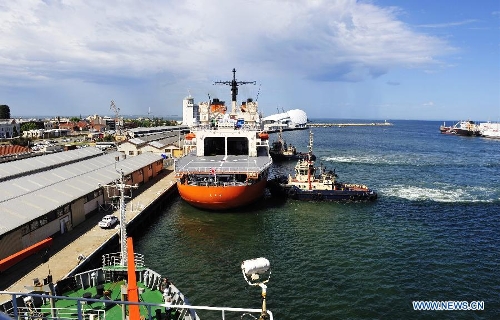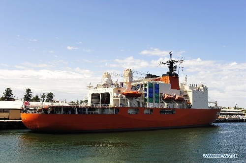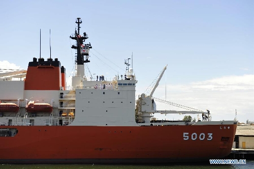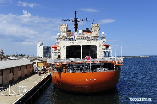 Japanese icebreaker Shirase is pushed to dock in Fremantle, Australia, Nov. 22, 2013. The Chinese research vessel and icebreaker Xuelong (Snow Dragon) met with the Japanese vessel at the same port in Australia, and both of them will leave for Antarctica to conduct scientific expedition. (Xinhua/Zhang Jiansong)