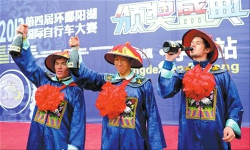 Cyclists celebrate with champagne in the winner's circle after the second stage of the Fourth Poyang Lake International Cycling Race in Jingdezhen, Jiangxi Province on November 24. Event organizers arranged for the top three cyclists, winner Tulu Kanggai (center), Russian competitor surnamed Karimov (left) and Bana to dress as Qing Dynasty officials. Photo: xinhuanet.com