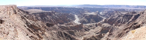 The combined photo taken on Nov. 21, 2013 shows the panorama of the Fish River Canyon in southern Namibia. Situated in southern Namibia, Fish River Canyon is the largest canyon in Africa and one of the most visited places in the country. It measures about 160km in length, up to 27km in width and 550m at its deepest point. With a history of hundreds of millions of years, the canyon is a unique combination of tectonic, volcanic, climatic and erosional forces that created this "geologist's paradise". (Xinhua/Gao Lei)