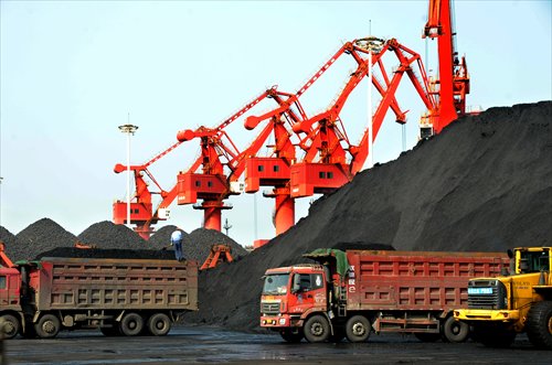 Trucks load imported coal at the port of Lianyungang in East China's Jiangsu Province. Photo: IC