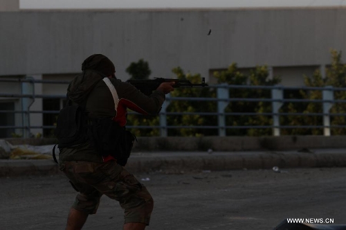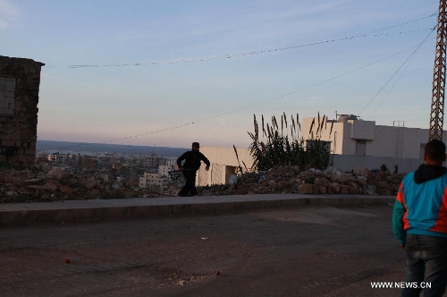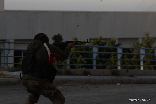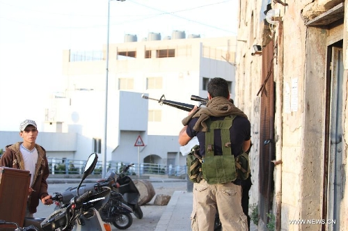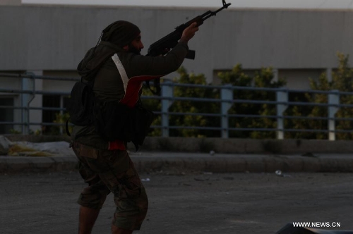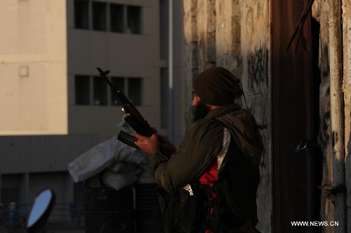 A militant is seen during an exchange of gunfire in Tripoli, Lebanon, Nov. 30, 2013. A new round of clashes erupted Saturday in Lebanon's northern port city of Tripoli between the rival Sunni neighborhood of Bab El Tebbaneh and mostly Alawite area of Jabal Mohsen, killing two men and injuring five others, a local security source told Xinhua. (Xinhua/Omar Ibrahim)