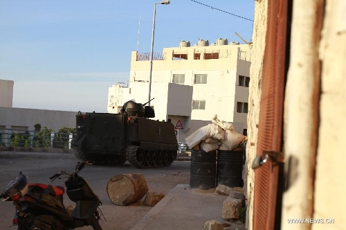 A military vehicle is seen during an exchange of gunfire in Tripoli, Lebanon, Nov. 30, 2013. A new round of clashes erupted Saturday in Lebanon's northern port city of Tripoli between the rival Sunni neighborhood of Bab El Tebbaneh and mostly Alawite area of Jabal Mohsen, killing two men and injuring five others, a local security source told Xinhua. (Xinhua/Omar Ibrahim)