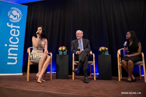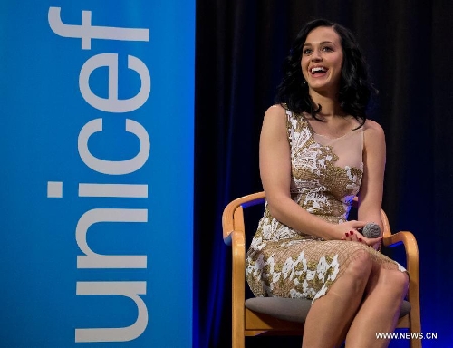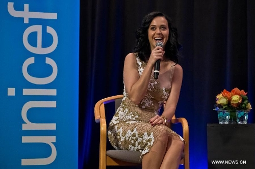 Singer Katy Perry (L) speaks during a panel discussion before being appointed UNICEF Goodwill Ambassador at the UNICEF headquarters in New York, US, on Dec. 3, 2013. Katy Perry will focus on improving the lives of the world's most vulnerable children and adolescents, according to the UNICEF. (Xinhua/Niu Xiaolei)