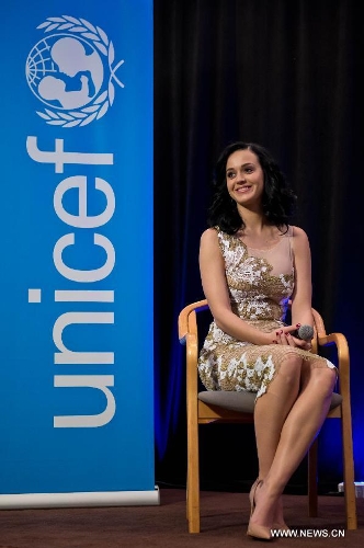 Singer Katy Perry attends a panel discussion before being appointed UNICEF Goodwill Ambassador at the UNICEF headquarters in New York, US, on Dec. 3, 2013. Katy Perry will focus on improving the lives of the world's most vulnerable children and adolescents, according to the UNICEF. (Xinhua/Niu Xiaolei)