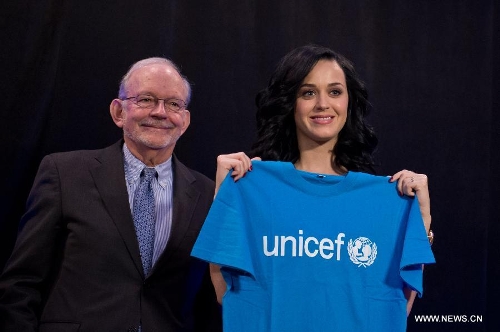 Singer Katy Perry (R) poses with UNICEF Executive Director Anthony Lake after she was appointed UNICEF Goodwill Ambassador at the UNICEF headquarters in New York, US, on Dec. 3, 2013. Katy Perry will focus on improving the lives of the world's most vulnerable children and adolescents, according to the UNICEF. (Xinhua/Niu Xiaolei)