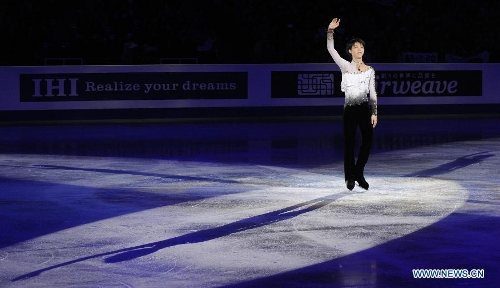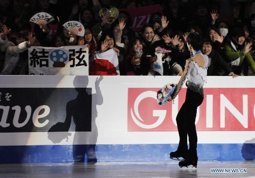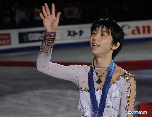 Yuzuru Hanyu of Japan waves to the audience after the award ceremony at the ISU Grand Prix of Figure Skating Final in Fukuoka, Japan, Dec. 6, 2013. Yuzuru Hanyu of Japan won the gold medal, Patrick Chan of Canada and Nobunari Oda of Japan settled for the second place and the third separately. (Xinhua/Stringer)
