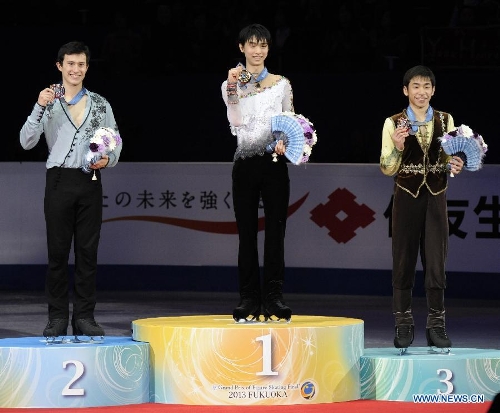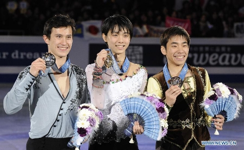 Patrick Chan of Canada, Yuzuru Hanyu of Japan and Nobunari Oda of Japan (L to R) smile for a photograph during the award ceremony at the ISU Grand Prix of Figure Skating Final in Fukuoka, Japan, Dec. 6, 2013. Yuzuru Hanyu of Japan won the gold medal, Patrick Chan of Canada and Nobunari Oda of Japan settled for the second place and the third separately. (Xinhua/Stringer)