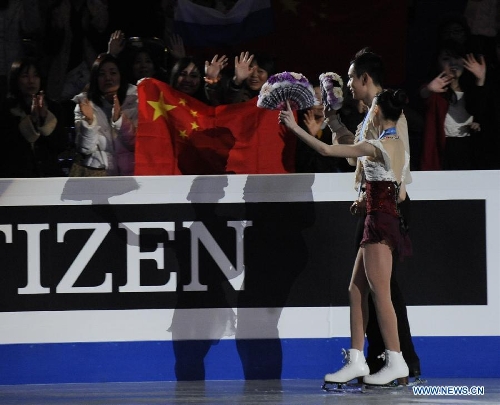 Yu Xiaoyu (L) and Jin Yang of China wave to the audience after the award ceremony for junior pairs at the ISU Grand Prix of Figure Skating Final in Fukuoka, Japan, Dec. 6, 2013. Yu Xiaoyu and Jin Yang won the gold medal. (Xinhua/Stringer)