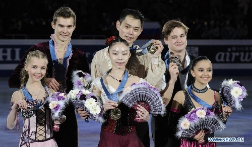 Yu Xiaoyu (C, front) and Jin Yang (C, rear) of China, Maria Vigalova (L, front) and Egor Zakroev (L, rear) of Russia, and Lina Fedorova (R, front) and Maxim Miroshkin (R, rear) of Russia pose for a photograph during the award ceremony for junior pairs at the ISU Grand Prix of Figure Skating Final in Fukuoka, Japan, Dec. 6, 2013. Yu Xiaoyu and Jin Yang won the gold medal while Vigalova and Zakroev, and Fedorova and Miroshkin settled for the silver and the bronze separately. (Xinhua/Stringer)