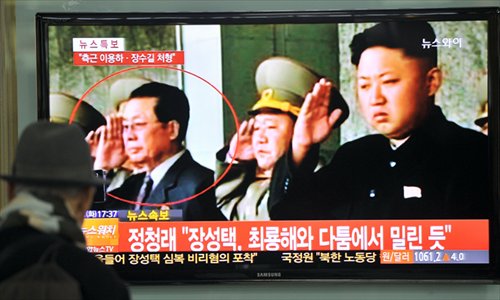 A South Korean man watches TV news about the alleged dismissal of Jang Song-thaek (circled), North Korean leader Kim Jong-un’s uncle, at a railway station in Seoul on Tuesday. Photo: AFP