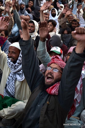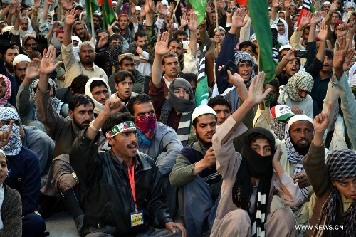 Pakistani Sunni Muslims shout slogans during a protest in southwest Pakistan's Quetta on Dec. 8, 2013, against the killing of a Sunni Muslim leader in Lahore. Gunmen shot dead a Sunni Muslim leader in the latest sectarian attack to hit Pakistan's eastern city of Lahore. (Xinhua/Asad)