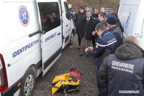Official of Chinese Embassy in France Li Ping (3rd, L) inspects the site of a helicopter crash in Lugon-et-l'e-du-Carnay, France, Dec. 21, 2013.Rescue teams scoured the Dordogne river in southwestern France after a helicopter carrying three Chinese went down on Friday. (Xinhua/Fabien Cottereau)