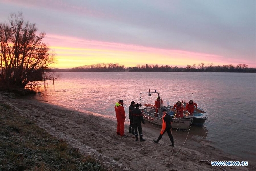 Rescuers work on the boats on the Dordogne River at the site of a helicopter crash in Lugon-et-l'e-du-Carnay, France, Dec. 20, 2013. Rescue teams scoured the Dordogne river in southwestern France after a helicopter carrying three Chinese went down on Friday. (Xinhua/Fabien Cottereau)