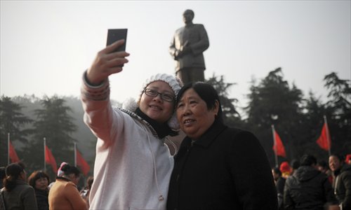 Two Chinese women take a photo in front of a bronze statue of Chairman Mao Zedong in Shaoshan, Central China's Hunan Province on Tuesday. Thousands of Mao's admirers will come to Shaoshan, Mao's birthplace, this week to mark the 120th anniversary of the former leader's birth. Photo: AFP