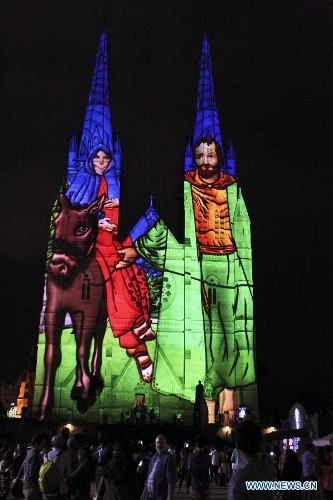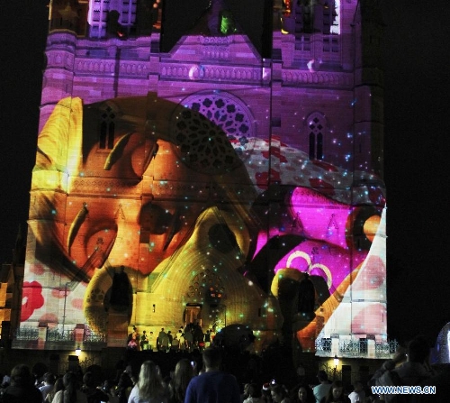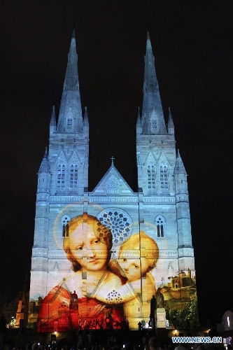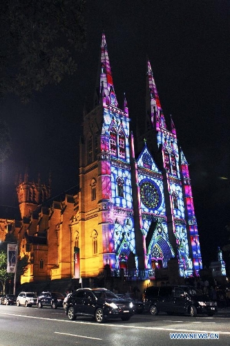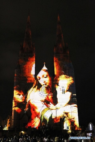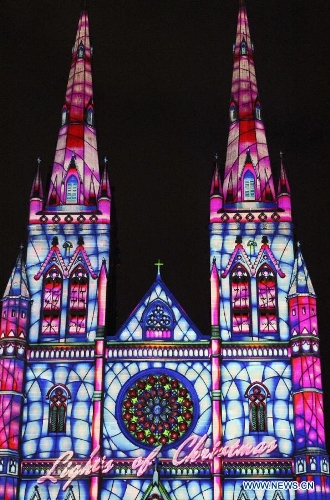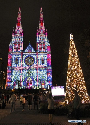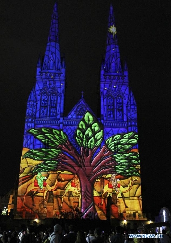 Photo taken on Dec. 24, 2013 shows the St. Mary's Cathedral lit up with animation in Sydney, Australia, on the Christmas Eve. (Xinhua/Jin Linpeng)
