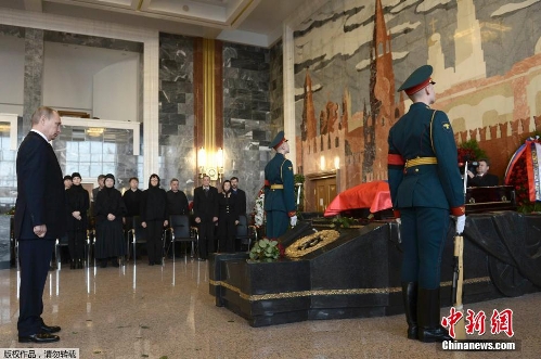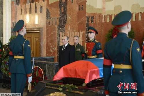 Russian President Vladimir Putin attends the funeral for Mikhail Kalashnikov, late designer of the famed Russian AK-47 assault rifle, in Moscow, Russia, on Dec. 27, 2013. (Photo: chinanews.com)