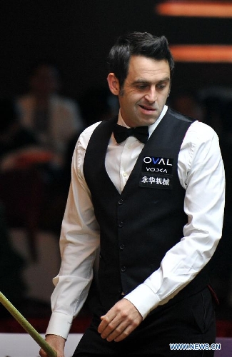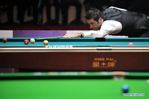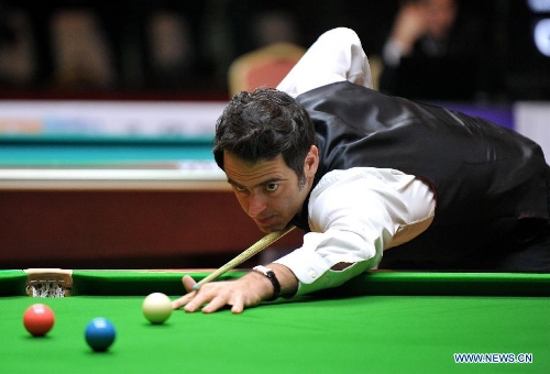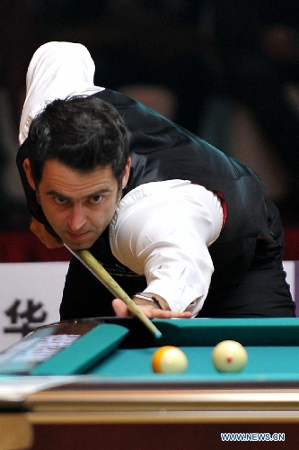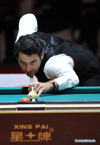 Britain's world champion snooker player Ronnie O'Sullivan competes in a snooker game against Chinese billiard star Pan Xiaoting in Yanzhou, east China's Shandong Province, Dec. 28, 2013. O'Sullivan and Pan challenged each other in a nine ball game and a snooker game Saturday. The match ended in a 1-1 draw. (Xinhua/Zhu Zheng)