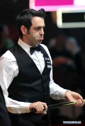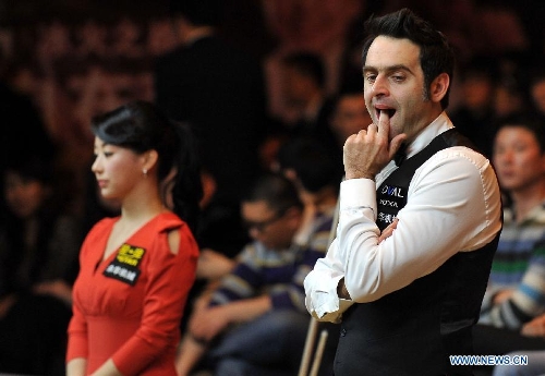 Britain's world champion snooker player Ronnie O'Sullivan reacts in a nine ball game against Chinese billiard star Pan Xiaoting, known as the queen of Nine Ball, in Yanzhou, east China's Shandong Province, Dec. 28, 2013. O'Sullivan and Pan challenged each other in a nine ball game and a snooker game Saturday. The match ended in a 1-1 draw. (Xinhua/Zhu Zheng)