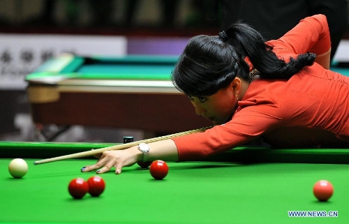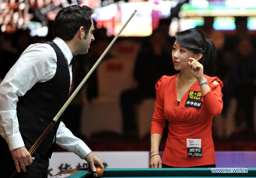 Chinese billiard star Pan Xiaoting competes in a snooker game against England's famous snooker player Ronnie O'Sullivanm in Yanzhou, east China's Shandong Province, Dec. 28, 2013. O'Sullivan and Pan challenged each other in a nine ball game and a snooker game Saturday. The match ended in a 1-1 draw. (Xinhua/Zhu Zheng)