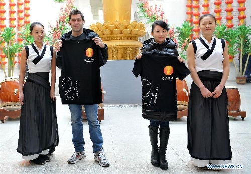 Chinese billiard star Pan Xiaoting (2nd, R) poses with Britain's world champion snooker player Ronnie O'Sullivan (2nd, L) after their visit to the Yanzhou Museum in Yanzhou, east China's Shandong Province, Dec. 28, 2013. O'Sullivan and Pan challenged each other in a nine ball game and a snooker game Saturday in Yanzhou. The match ended in a 1-1 draw. (Xinhua/Zhu Zheng)
