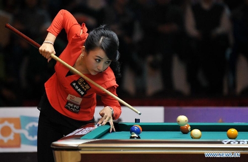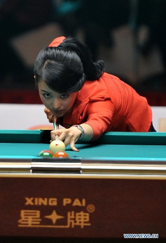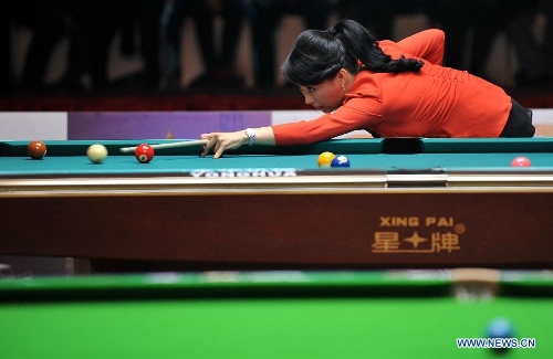 Chinese billiard star Pan Xiaoting competes during a match against Britain's world champion snooker player Ronnie O'Sullivan in Yanzhou, east China's Shandong Province, Dec. 28, 2013. O'Sullivan and Pan challenged each other in a nine ball game and a snooker game Saturday. The match ended in a 1-1 draw. (Xinhua/Zhu Zheng)