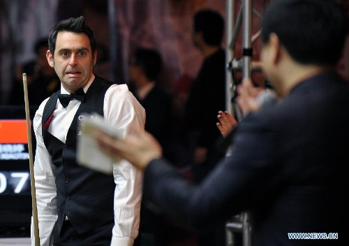 Britain's world champion snooker player Ronnie O'Sullivan makes faces during his match against Chinese billiard star Pan Xiaoting in Yanzhou, east China's Shandong Province, Dec. 28, 2013. O'Sullivan and Pan challenged each other in a nine ball game and a snooker game Saturday. The match ended in a 1-1 draw. (Xinhua/Zhu Zheng)