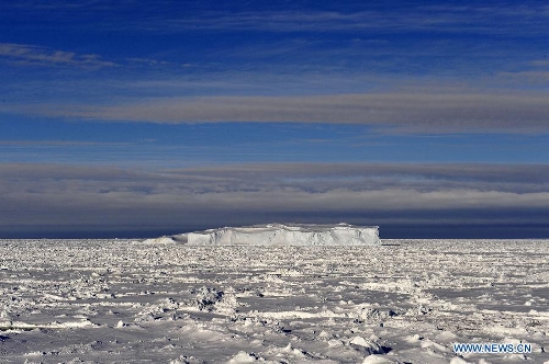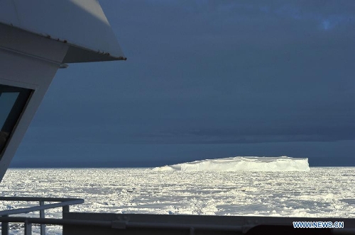 Photo taken on Jan. 3, 2013 shows an iceberg in the way of the Chinese icebreaker Xuelong's (Snow Dragon) evacuation route in a sea-ice field off Antarctica, Jan. 3, 2014. Xuelong is blocked by thick ice after successfully transferred passengers aboard stranded Russian science vessel MV Akademik Shokalskiy Thursday. (Xinhua/Zhang Jiansong)