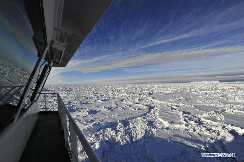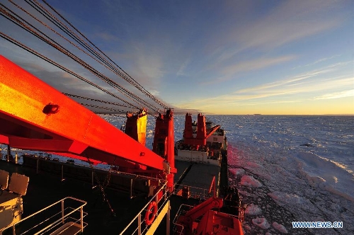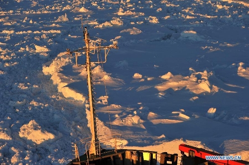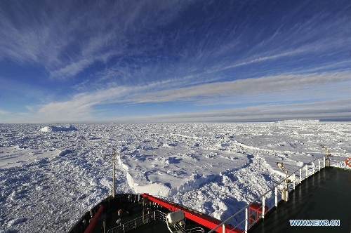 The Chinese icebreaker Xuelong, or Snow Dragon, anchors in a sea-ice field off Antarctica, Jan. 3, 2014. Xuelong is blocked by thick ice after successfully transferred passengers aboard stranded Russian science vessel MV Akademik Shokalskiy Thursday. (Xinhua/Zhang Jiansong)