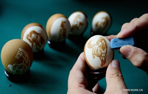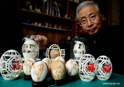 Craftsman Shan Mengbo shows his eggshell carvings in Ji'nan, esat China's Shandong Province, Jan. 3, 2014. As the Spring Festival draws, Shan created several eggshell carvings with a blessing word or a horse pattern since 2014 was the Year of the Horse in the Chinese Zodiac. (Xinhua/Zhao Xiaoming)