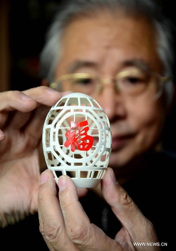 Craftsman Shan Mengbo shows his eggshell carved with the Chinese character "Fu", which denotes good fortune, in Ji'nan, esat China's Shandong Province, Jan. 3, 2014. As the Spring Festival draws, Shan created several eggshell carvings with a blessing word or a horse pattern since 2014 was the Year of the Horse in the Chinese Zodiac. (Xinhua/Zhao Xiaoming)