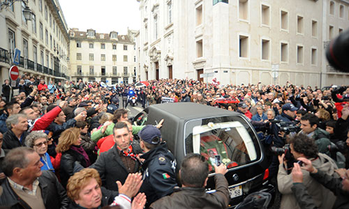 Earlier, about 10,000 mourners applauded and cheered as six pall-bearerscarried the coffin and placed it on a golden plinth in the centre of the pitch at Benfica's "Stadium of Light."