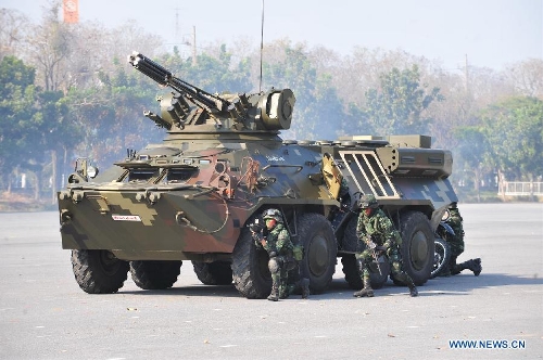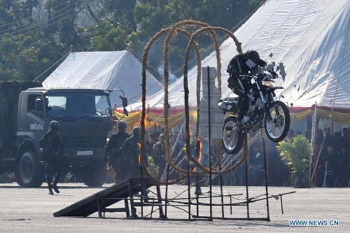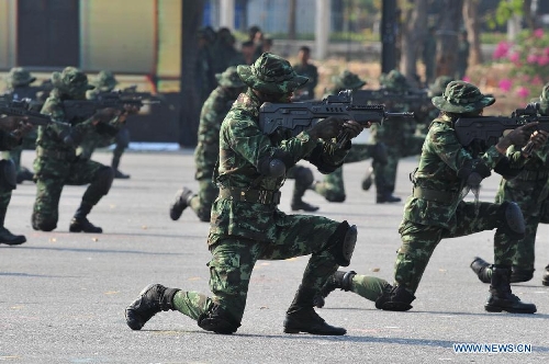 Thai soldiers participate in a training during celebrations of the Royal Thai Armed Forces Day at a military base in Bangkok, Thailand, Jan. 18, 2014. (Xinhua/Rachen Sageamsak)