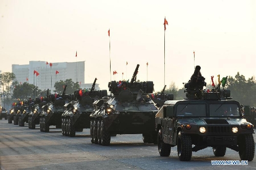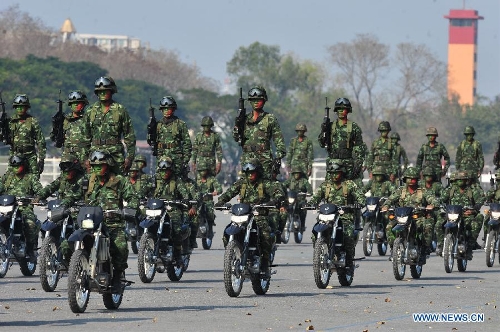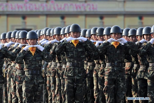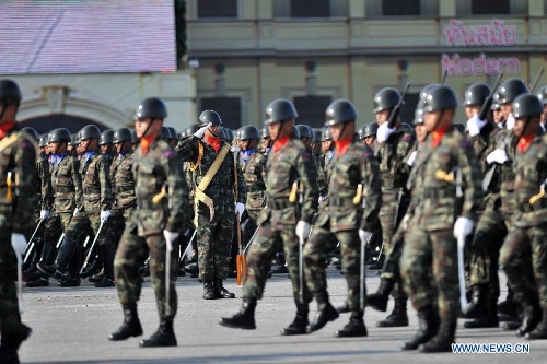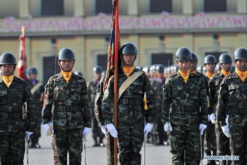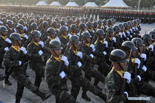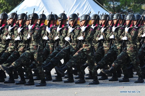Thai soldiers parade during celebrations of the Royal Thai Armed Forces Day at a military base in Bangkok, Thailand, Jan. 18, 2014. (Xinhua/Rachen Sageamsak)