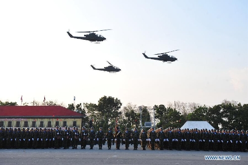Thai soldiers parade during celebrations of the Royal Thai Armed Forces Day at a military base in Bangkok, Thailand, Jan. 18, 2014. (Xinhua/Gao Jianjun)