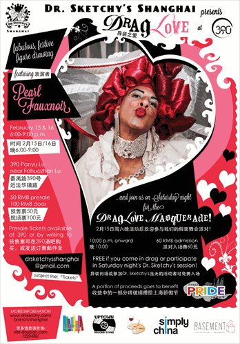 The next Shanghai Dr. Sketchy's event will take place on February 15 and 16 at 390 Shanghai (390 Panyu Road, 6431-2353) with the theme Drag Love. The three-hour sketch event will feature November's drag competition winner Pearl Fauxnoir. Participants will also have the chance to submit their work for gallery exhibition during Pride week (June 13-21). Both nights will begin at 6 pm and participants are expected to bring their own art supplies. Presale tickets are 50 yuan ($8.26)(100 yuan at the door), and can be purchased at 390 Shanghai or by e-mailing to drsketchysshanghai@gmail.com.