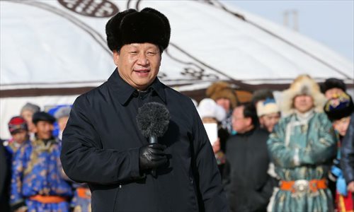 Chinese President Xi Jinping speaks at a winter Nadam Fair in Xilin Gol grassland, north China's Inner Mongolia Autonomous Region, ahead of the upcoming Chinese lunar new year. Xi paid a visit to Inner Mongolia recently and extended lunar new year greetings to people of all ethnic groups, compatriots from Hongkong, Macao and Taiwan, and all overseas Chinese. Photo: Xinhua