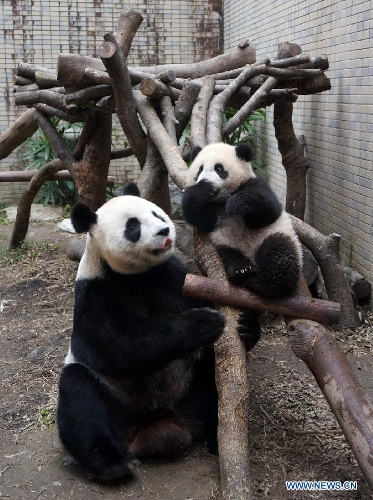 Giant panda cub Yuan Zai plays with its mother Yuan Yuan at the Taipei Zoo in Taipei, southeast China's Taiwan, Jan. 31, 2014. The cub, born on July 6, 2013, is the first baby of Tuan Tuan and Yuan Yuan, which were given as a goodwill gift to Taiwan by the Chinese mainland. (Xinhua)