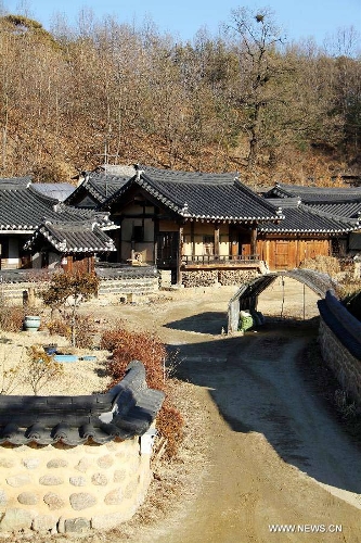 The photo taken on Feb. 4, 2014 shows a traditional South Korean house at Naeseongcheon Village in Yeongju. Water surrounds three sides of the villages, making the village look like an island. The village has silvery-white sand beach along the river and low hills with many pine and spindle trees surrounding the river from the other side. There is a stable bridge across the river to connect the village to the neighboring village. (Xinhua/Peng Qian)