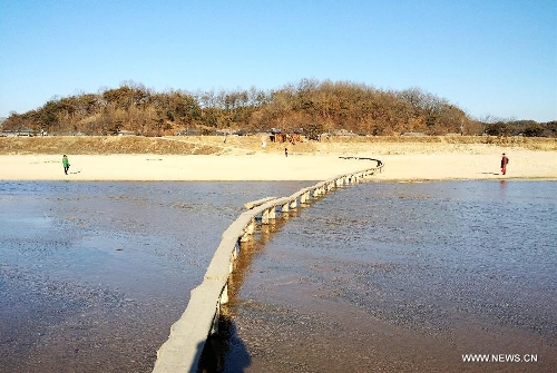 A bridge is seen at Naeseongcheon Village in Yeongju, Feb. 4, 2014. Water surrounds three sides of the villages, making the village look like an island. The village has silvery-white sand beach along the river and low hills with many pine and spindle trees surrounding the river from the other side. There is a stable bridge across the river to connect the village to the neighboring village. (Xinhua/Peng Qian)