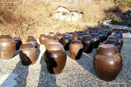 Cans for making kimchi are seen at Naeseongcheon Village in Yeongju, Feb. 4, 2014. Water surrounds three sides of the villages, making the village look like an island. The village has silvery-white sand beach along the river and low hills with many pine and spindle trees surrounding the river from the other side. There is a stable bridge across the river to connect the village to the neighboring village. (Xinhua/Peng Qian)