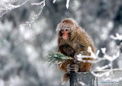 A macaque is seen after a heavy snowfall in Lushan Mountain, east China's Jiangxi province, Feb. 9, 2014. (Xinhua/Zhou Ke)