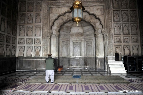 A man offers prayer at the Badshahi Mosque in eastern Pakistan's Lahore on Feb. 9, 2014. The Badshahi Mosque meaning the 'Imperial Mosque', which was commissioned by the sixth Mughal Emperor Aurangzeb in 1671 and completed in 1673, is the second largest mosque in Pakistan and South Asia and the fifth largest mosque in the world. Epitomizing the beauty, passion and grandeur of the Mughal era, it is Lahore's most famous landmark and a major tourist attraction. (Xinhua/Jamil Ahmed)