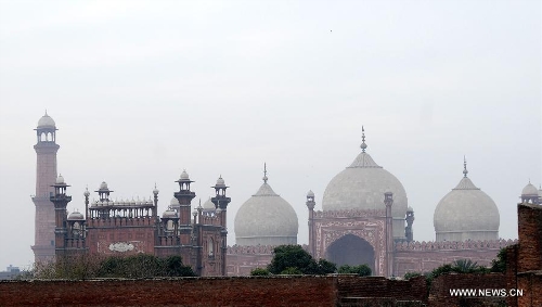Photo taken on Feb. 9, 2014 shows the view of the Badshahi Mosque in eastern Pakistan's Lahore. The Badshahi Mosque meaning the 'Imperial Mosque', which was commissioned by the sixth Mughal Emperor Aurangzeb in 1671 and completed in 1673, is the second largest mosque in Pakistan and South Asia and the fifth largest mosque in the world. Epitomizing the beauty, passion and grandeur of the Mughal era, it is Lahore's most famous landmark and a major tourist attraction. (Xinhua/Jamil Ahmed)